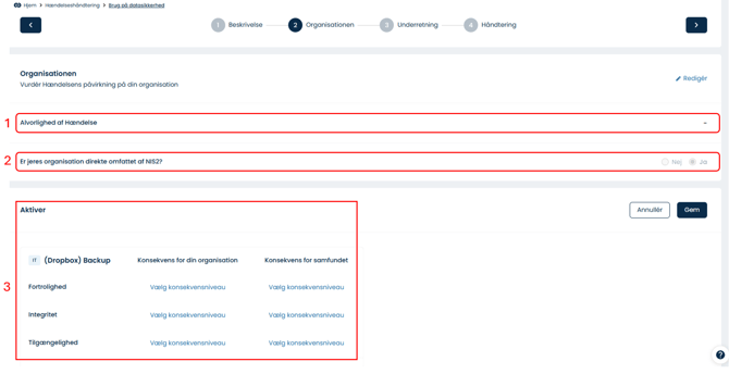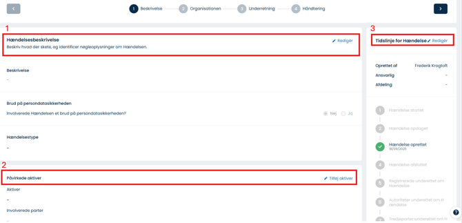 Her bør du (1) beskrive hændelsen så godt som muligt, (2) vælge de påvirkede aktiver samt (3) tilføje detaljer omkring tidslinjen for hændelsen. Klik Redigér i hvert felt for at tilføje information og glem ikke at tilføje 'hændelsestype'
