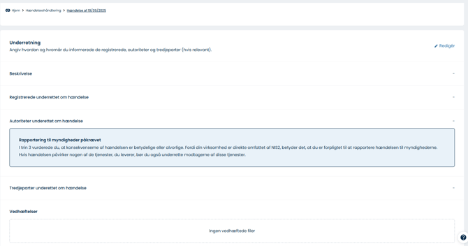 Bemærk: har du sagt ja til, at din organisation er underlagt NIS2 i forrige skridt, vil ComplyCloud minde dig om, at du bør indberette hændelsen til myndighederne såfremt din alvorlighed er vurderet som 'kritisk'
