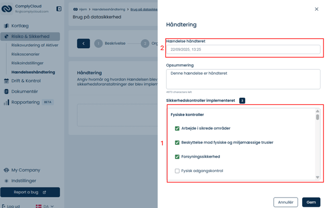 Her kan (1) tilføje sikkerhedskontroller fra ComlpyCloud's sikkerhedskatalog og lave en overordnet opsummering som dokumentation for håndtering af hændelsesforløbet.