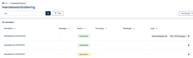 Så snart du vurderer at hændelsen er håndteret bør du tilføje en dato under (2) 'hændelse håndteret' Så snat du tilføjer en data her, vil hændelsen blive håndteret som 'Håndteret' i overblikket. Alle andre hændelser er markeret med 'igangværende' Se forneden: