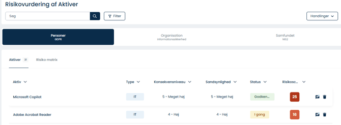 Tidligere kunne du lave risikovurderinger baseret på, om du vurderede registrerede personer (data subjects), din organisation eller samfundet (NIS2). For at gøre det enklere kan du nu kun risikovurdere dine aktiver baseret på Privatliv og Sikkerhed. |