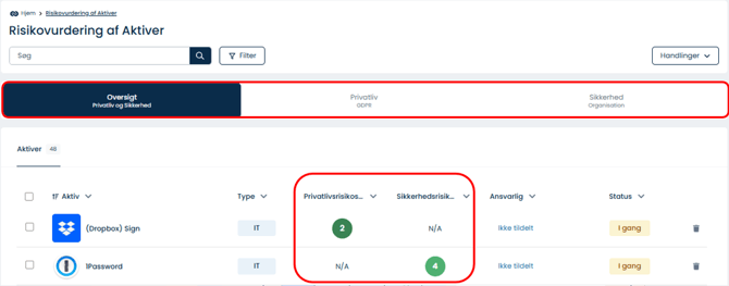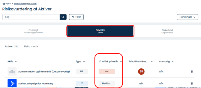 Du risikovurderer nu kun systemer og aktiver baseret på Privatliv eller Sikkerhed.