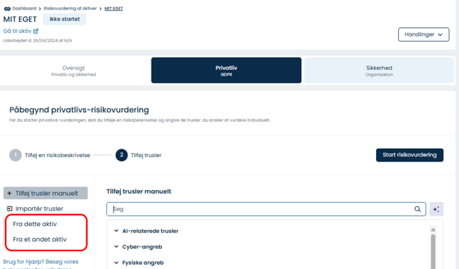 Når du opretter en ny risikovurdering, kan du nu kopiere trusler og sikkerhedsforanstaltninger enten fra et andet aktiv eller fra aktivets eksisterende vurdering af privatliv/sikkerhed. |