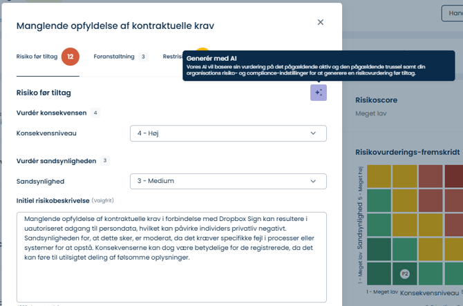 Ved hver trusselsvurdering kan du bruge AI til at få forslag til risikoscorer, risikobeskrivelser og afværgeforanstaltninger – så du hurtigere kan udfylde dele af din risikovurdering.
