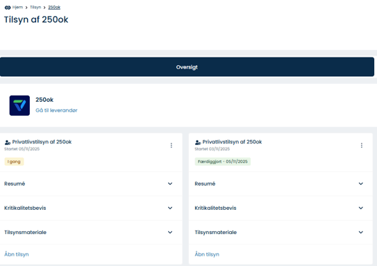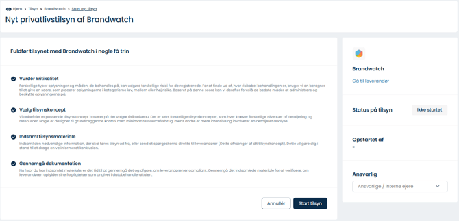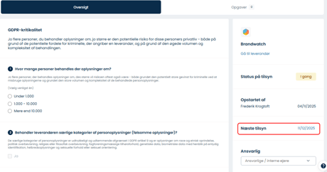 Vælg en leverandør fra oversigten > klik på de tre prikker > Start tilsyn > vælg 'privatlivstilsyn' eller 'sikkerhedstilsyn'