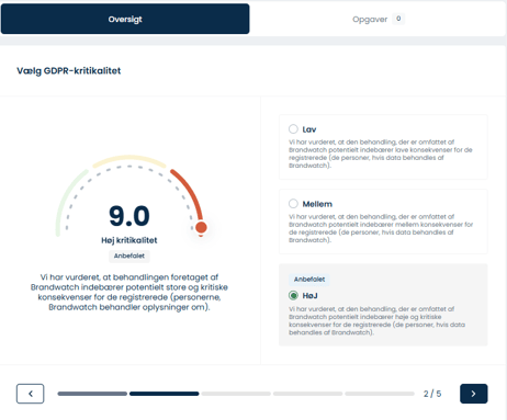 Besvar de fire spørgsmål, der passer til leverandøren - herefter foreslår ComplyCloud automatisk leverandørens kritikalitet. Herunder er kritikaliteten valgt som høj: