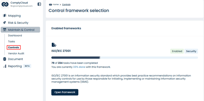 To operationalise your ISMS, you can activate one or more control frameworks under Maintain & Control > Controls.