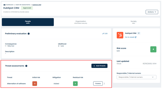 When all threats for an asset are assessed, the asset’s overall risk score will automatically reflect the highest remaining risk – also known as the residual risk.