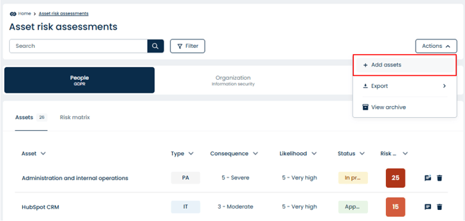 Go to Asset Risk Assessment > Actions > Add assets