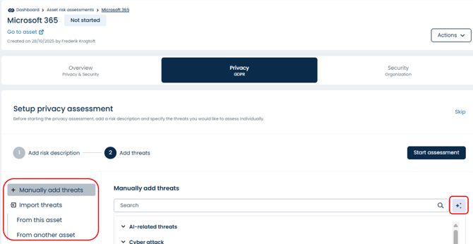Copy threats “From this asset”: If you have already performed a risk assessment for either Privacy or Security, you can copy the threats from there
